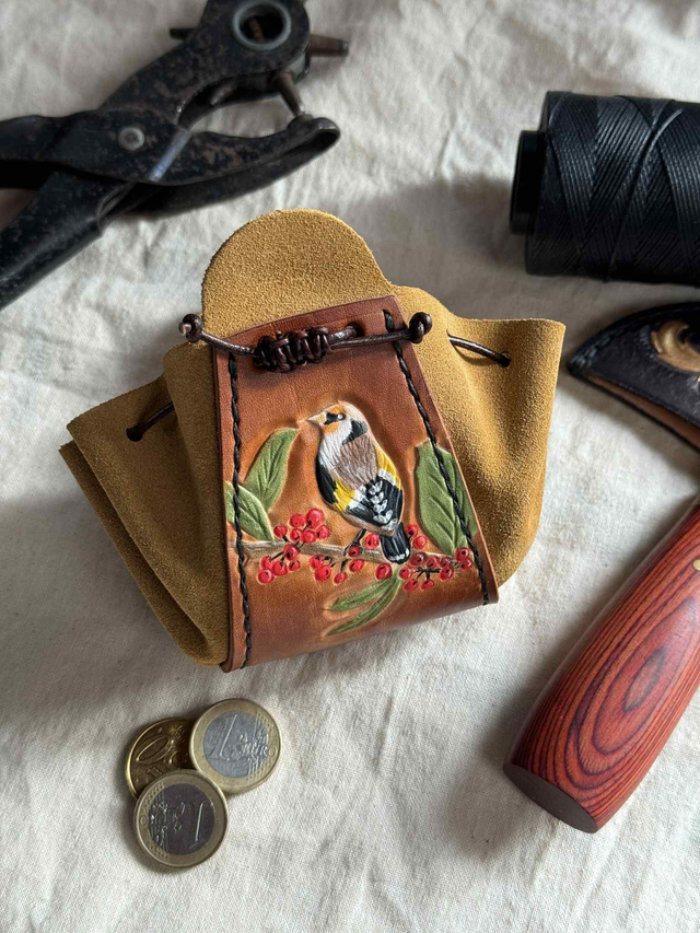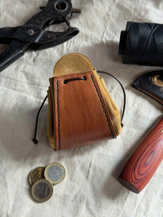Chaque bourse est soigneusement découpée, teintée, repoussée et cousue à la main avec du cuir de qualité.