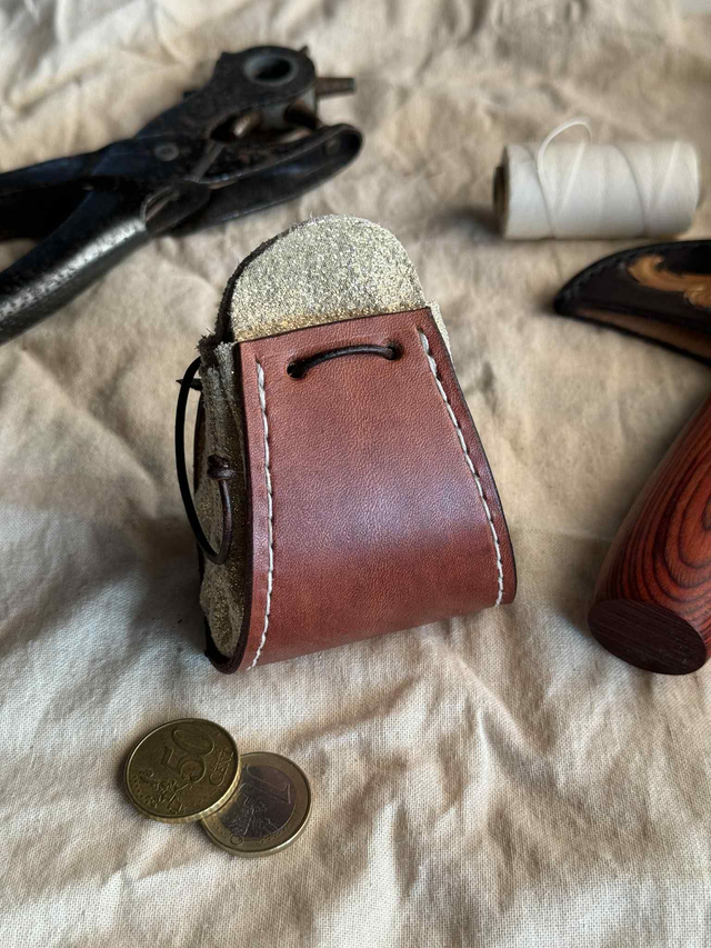 Mesurant 9 cm de haut, elle est idéale pour ce glisser dans votre sac. Chaque bourse est soigneusement découpée, teintée et cousue à la main avec du cuir de qualité.