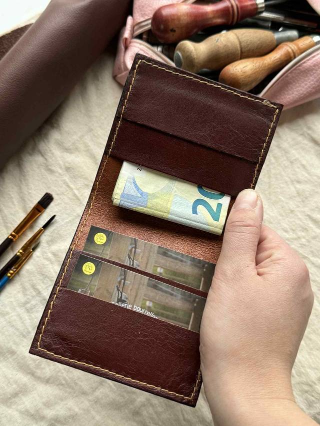 Chaque porte-cartes est découpé, assemblé et cousu entièrement à la main, point par point, garantissant une grande robustesse. Le cuir utilisé est un cuir belge ou italien de haute qualité, reconnu pour sa résistance et sa tenue dans le temps. Avec les années, il développe une patine naturelle, rendant chaque modèle encore plus unique.