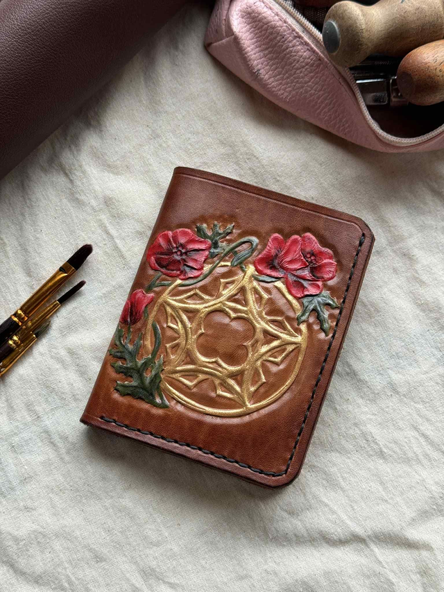 Ce portefeuille en cuir fait main est une pièce artisanale unique, réalisée selon des techniques traditionnelles de maroquinerie. Il est orné d'une rosace et de coquelicots, symbole de mémoire et de renouveaux.