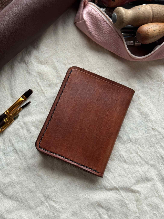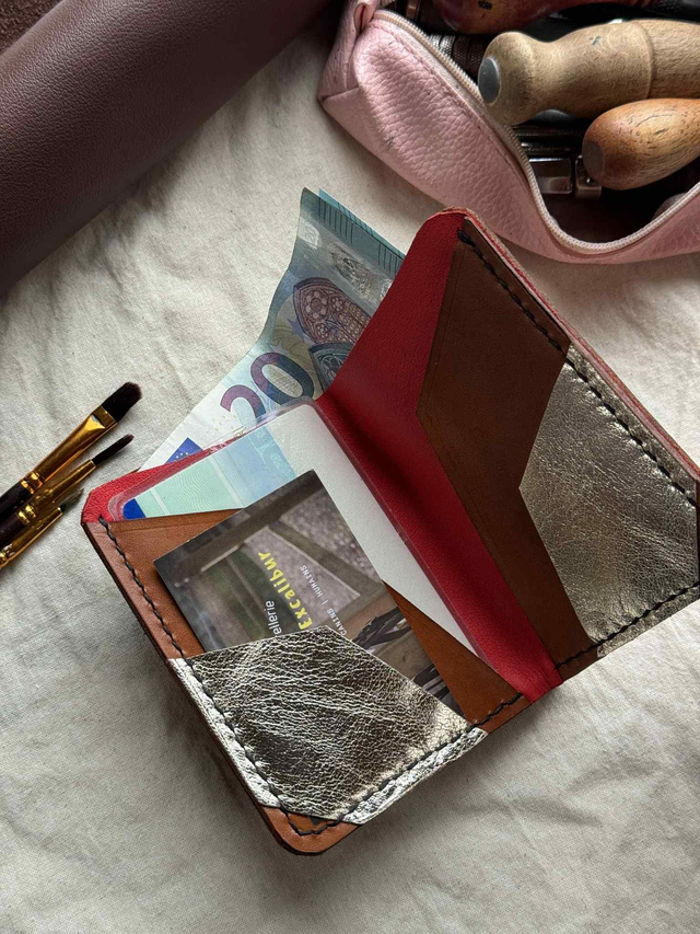 Chaque portefeuille est découpé, assemblé et cousu entièrement à la main, point par point, garantissant une grande robustesse. Le cuir utilisé est un cuir belge ou italien de haute qualité, reconnu pour sa résistance et sa tenue dans le temps. Avec les années, il développe une patine naturelle, rendant chaque modèle encore plus unique.
